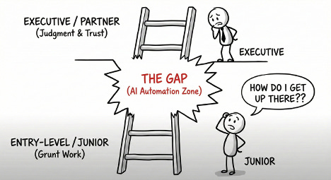The middle is where consulting analysts become senior associates. Where associates become engagement managers. Where you learn the craft. AI is eating that rung. And breaking the long established career ladder.