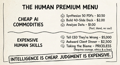 The shift is simple: Intelligence is now cheap. Judgment is still expensive. And if my kids want to pursue a future career, they’ll have to consider the new human premium ‘menu’.