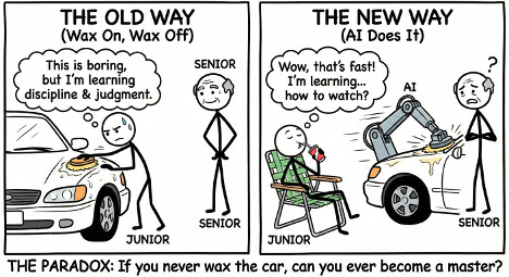 Now imagine AI does all the waxing. The junior sits in a lawn chair, sipping a drink, watching. Sure, the car gets waxed faster. But here’s the question that keeps me up at night: If you never wax the car, can you ever become a master?